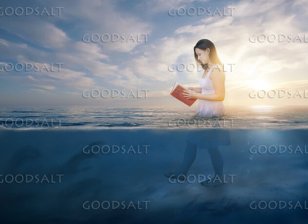 A woman reads her Bible as she walks into deep waters by Kevin Carden