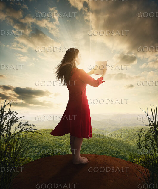 A woman reads her Bible on top of a hill by Kevin Carden