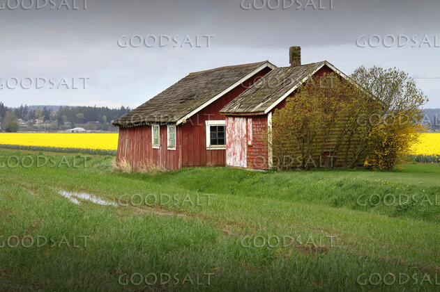 A red abandoned barn with a yellow field background and dark moody sky by John Baker