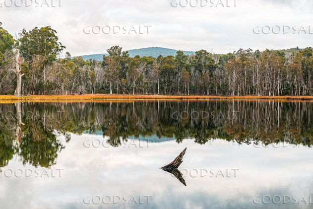 Remote lake is still and silent as it reflects its circle of trees and dead trunks. by Mal Austin
