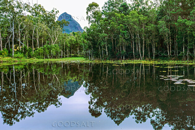 Private dam reflection with trees and steep rock mountain peak. by Mal Austin