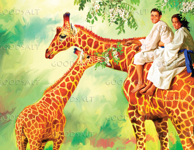 Two young people take a ride on a giraffe in paradise. by General Conference