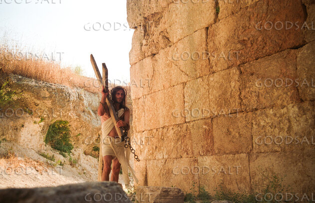 Jesus carries cross along dirt pathway to Calvary. by Frank Gampel