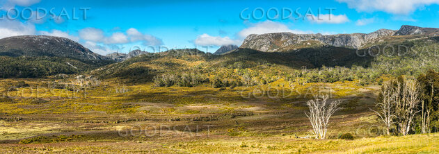 Treed bushland and scrub with rocky hills and jagged peaks. by Mal Austin