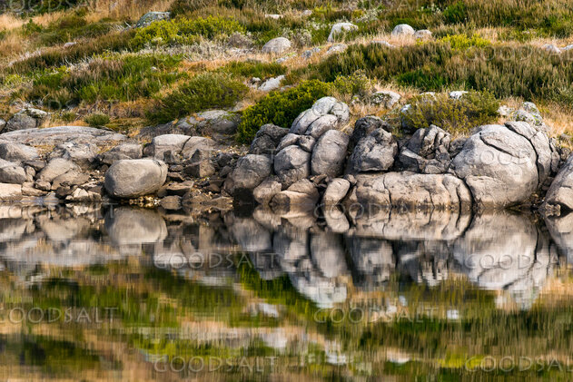 Huge granite base rock and alpine foilage are mirrored in the waters of an alpine lake. by Mal Austin