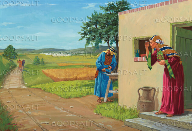 Elijah and his servant come to town, and a woman and her husband from Shunem see him approach. by Review & Herald Publishing