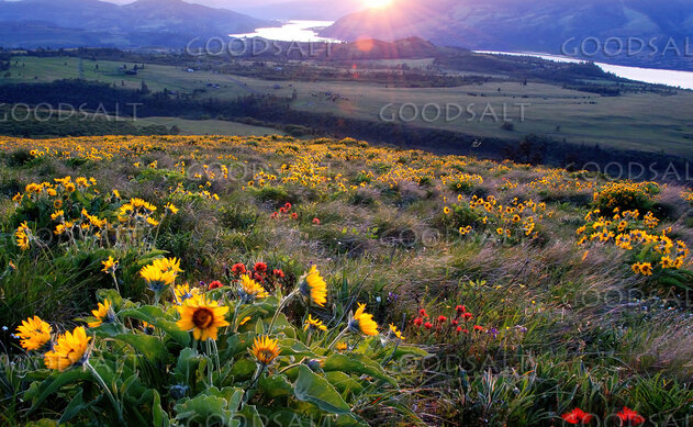 The sun set over the Columbia river, spotlighting the blooming balsam root and paintbrushes. Springtime blooms. Near Mosier, Oregon by Mary Lane Anderson
