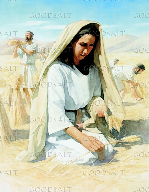Ruth is kneeling to pick up grain while workers are in the background harvesting the wheat. by Lifeway Collection