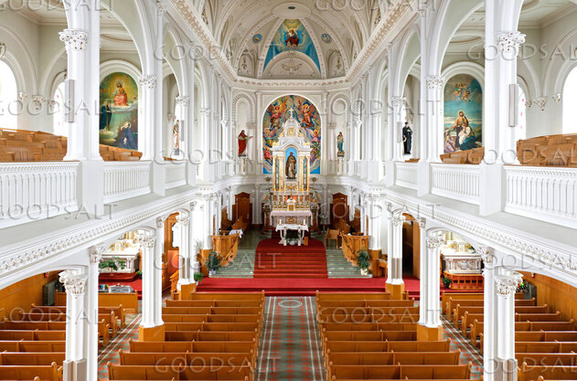 View of the interior of Saint-Pierre Catholic Church in Cheticamp, Nova Scotia, including the altar and pews,as seen from the balcony above by John Baker