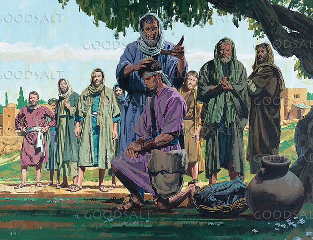 Elderly Samuel anointing young David as king. by Lifeway Collection