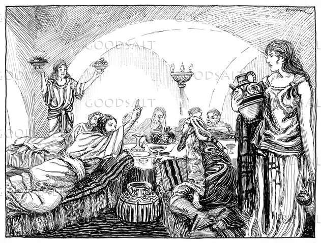 A servant girl carrying jars speaks with Christ, who is reclining at a meal. by Review & Herald Publishing