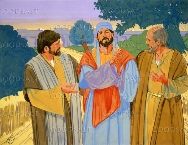 Three men discuss something on a walk away from a city. by Lifeway Collection