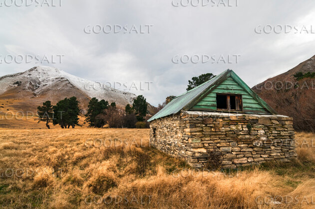 Shearing shed, dry stone building and dry grass under a stormy sky. by Mal Austin
