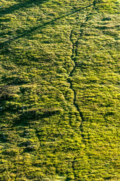 Steep hillside grass with sheep tracks on farm land in bright morning sun. by Mal Austin