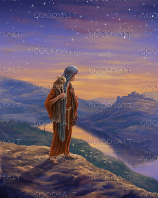 Shepherd boy with a lamb over his shoulders looking towards Bethlehem in the distance by Steve Bridger