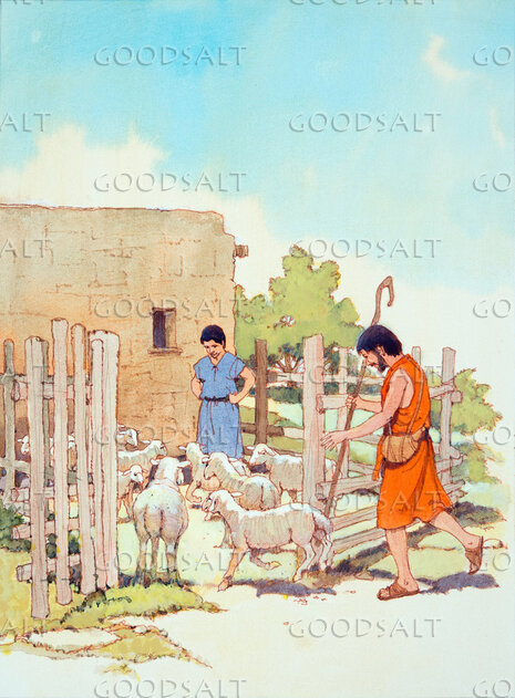 Shepherd taking his sheep to a place of safety, a fenced in yard. Another worker is within the yard and the shepherd is following his sheep through the sheep gate to shelter. The shepherd looks tired and bedraggled, bent over, is carrying a sheep crook or cane.
