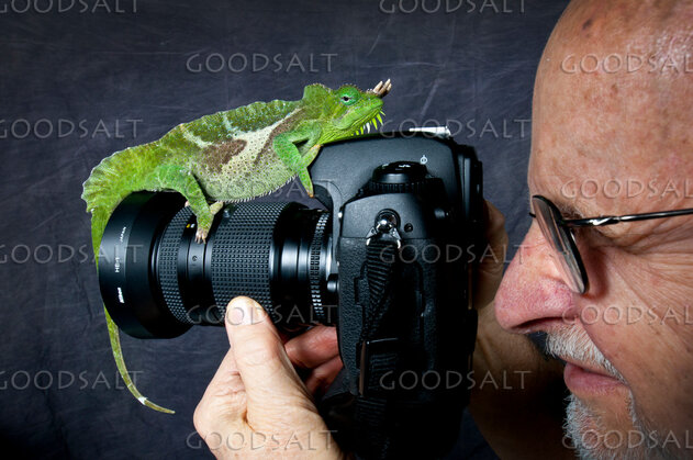 humorous photo of a photographer siting through his camera with a chameleon on his camera. by Deb Minnard