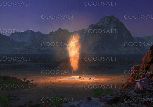 The wilderness tabernacle made by Moses as seen at night, with the Pillar of Fire over the Sanctuary. by Steve Creitz