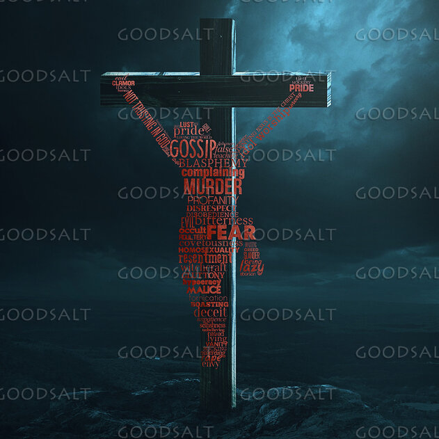 Word art of sins hanging from the cross. by Kevin Carden
