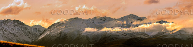 Snowy ranges at dazzling sunset last-light with lingering low clouds. by Mal Austin