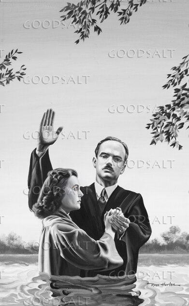 Vintage grayscale painting of a caucasian woman about to be baptized in a river or lake. by Review & Herald Publishing