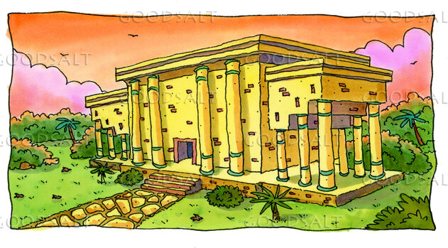 1 Kings 61 In the four hundred and eightieth year after the people of Israel came out of the land of Egypt, in the fourth year of Solomon's reign over Israel, in the month of Ziv, which is the second month, he began to build the house of the LORD.2 The house that King Solomon built for the LORD was sixty cubits long, twenty cubits wide, and thirty cubits high.3 The vestibule in front of the nave of the house was twenty cubits long, equal to the width of the house, and ten cubits deep in front of the house.4 And he made for the house windows with recessed frames.5 He also built a structure against the wall of the house, running around the walls of the house, both the nave and the inner sanctuary. And he made side chambers all around.6 The lowest story was five cubits broad, the middle one was six cubits broad, and the third was seven cubits broad. For around the outside of the house he made offsets on the wall in order that the supporting beams should not be inserted into the walls of the house.7 When the house was built, it was with stone prepared at the quarry, so that neither hammer nor axe nor any tool of iron was heard in the house while it was being built.8 The entrance for the lowest story was on the south side of the house, and one went up by stairs to the middle story, and from the middle story to the third.9 So he built the house and finished it, and he made the ceiling of the house of beams and planks of cedar.10 He built the structure against the whole house, five cubits high, and it was joined to the house with timbers of cedar.11 Now the word of the LORD came to Solomon,12 “Concerning this house that you are building, if you will walk in my statutes and obey my rules and keep all my commandments and walk in them, then I will establish my word with you, which I spoke to David your father.13 And I will dwell among the children of Israel and will not forsake my people Israel.” | |
