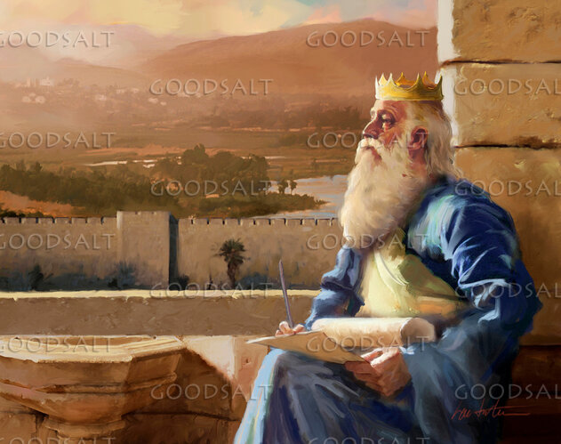 A king takes a moment from writing and looks out over the city by Lars Justinen