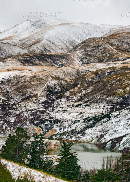 Old mining water lake encircled by snow sprinkled fields and rocky hills. by Mal Austin