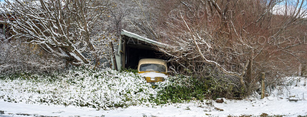 Old yellow Standard car in tumble-down garage overgrown and engulfed by weeds and trees, in snow. by Mal Austin