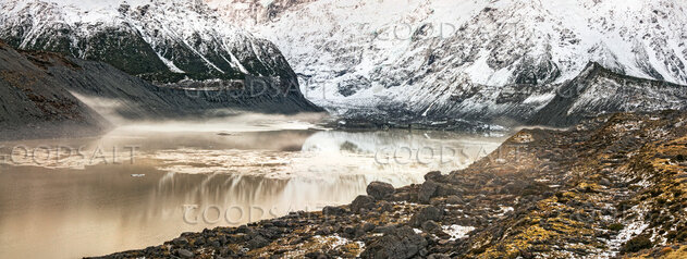 Gacier and lake behind huge numbers of rocks and boulders on foreground bank. by Mal Austin