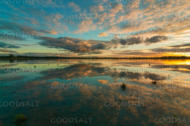 Spectacular sunset and reflection on weedy shallow lake.