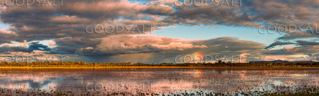 Spectacular sunset, rainbow and reflection on shallow weedy lake. by Mal Austin