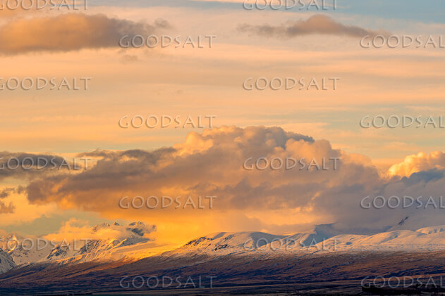 Spectacular sunset clouds and golden lit peaks on the side of a lake with a distant sun shower. by Mal Austin