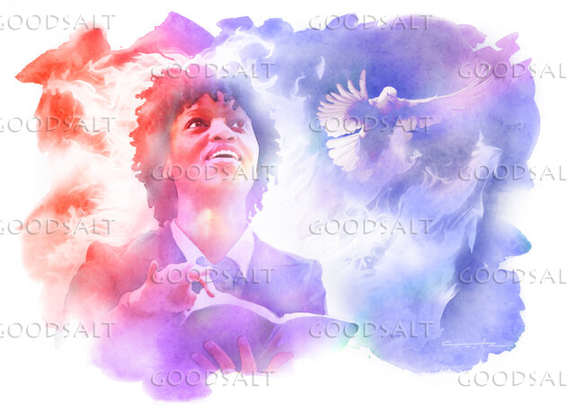 An African American woman studies her Bible and looks up in amazement, a dover flies over her shoulder, and flames from the Holy Spirit wrap her in power.