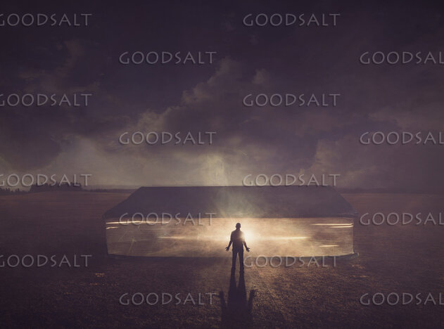 A large glowing Bible with a man standing in front of it. by Kevin Carden