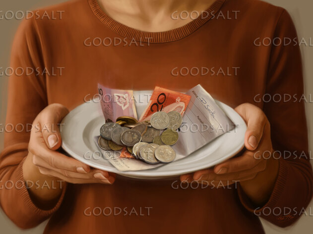 A lady holding a plate of money and tithe offerings for the Lord. We are all God's stewards, entrusted by Him with time, opportunities, abilities and possessions.