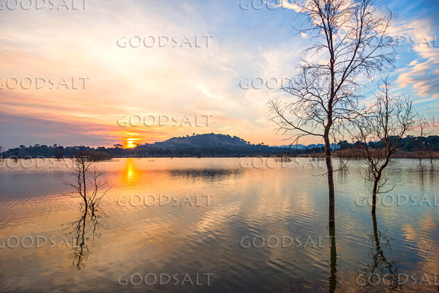 Dramatic cloudy and still-water sunset on lake water with the spindly trumks and branches of dead saplings dotted around. by Mal Austin