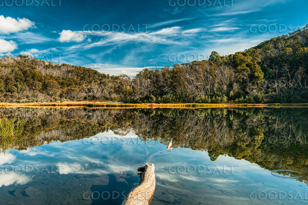 Fallen log reaches out into icy still waters with reflection of reeds and trees on far bank. by Mal Austin