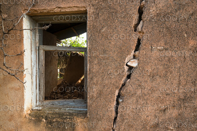 detail of crumbling window in derelict stone building by Mal Austin