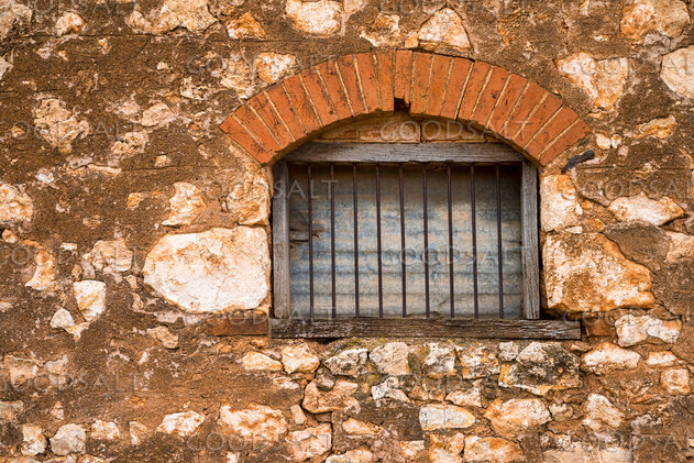 detail of crumbling window in derelict stone building
