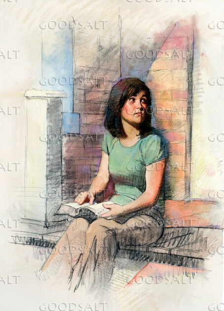 A young woman looks up from her Bible while sitting on her front step. by Bjorn Thorkelson