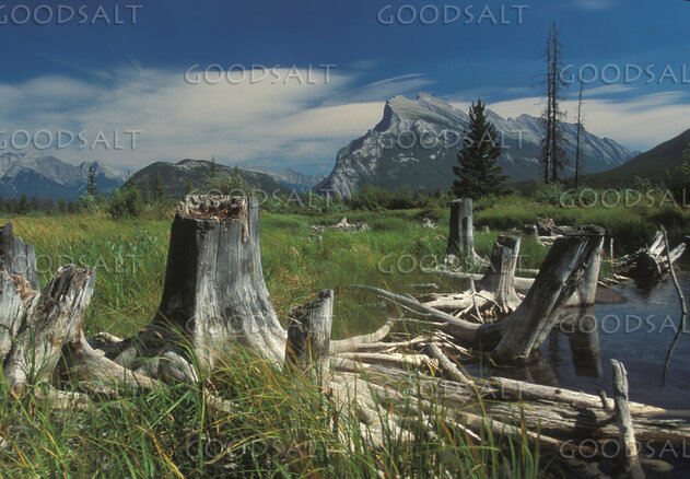Tree stumps along the shore of Vermillion Lakes with Mount Rundle near Banff National Park, Canada by John Baker