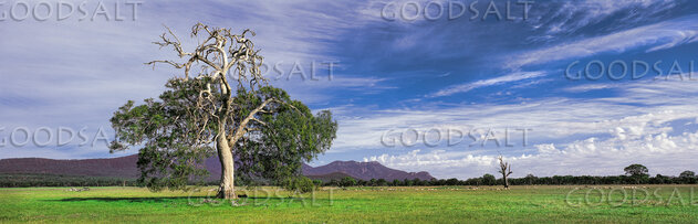 huge trees growing on flat land in front odistsnt sharp mountains. by Mal Austin