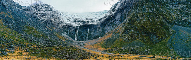 Stunning scenery which contains a waterfall in alpine remote landscape.