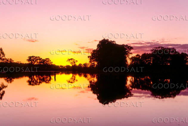Perfect pink and yellow sky sunset over tree lined banks of river. by Mal Austin