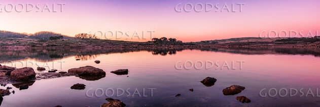 The pink and yellow first light of a sub-zero sunrise lights the surface of an alpine lake and scattered rocks. by Mal Austin