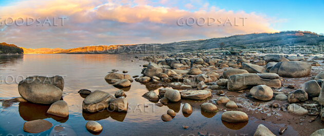 The pink and yellow first light of a sub-zero sunrise lights the surface of an alpine lake and its icy shoreline with scattered smooth rocks. by Mal Austin