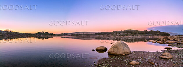 The pink and yellow first light of a sub-zero sunrise lights the surface of an alpine lake and scattered rocks. by Mal Austin
