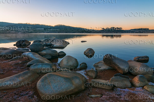 The pink and yellow first light of a sub-zero sunrise lights the surface of an alpine lake and its icy shoreline with scattered smooth rocks. by Mal Austin