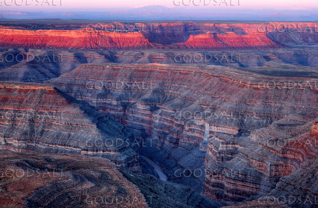 Sunrise view of the San Juan River from Muley Point with Navajo Mountain in the background. by Mary Lane Anderson